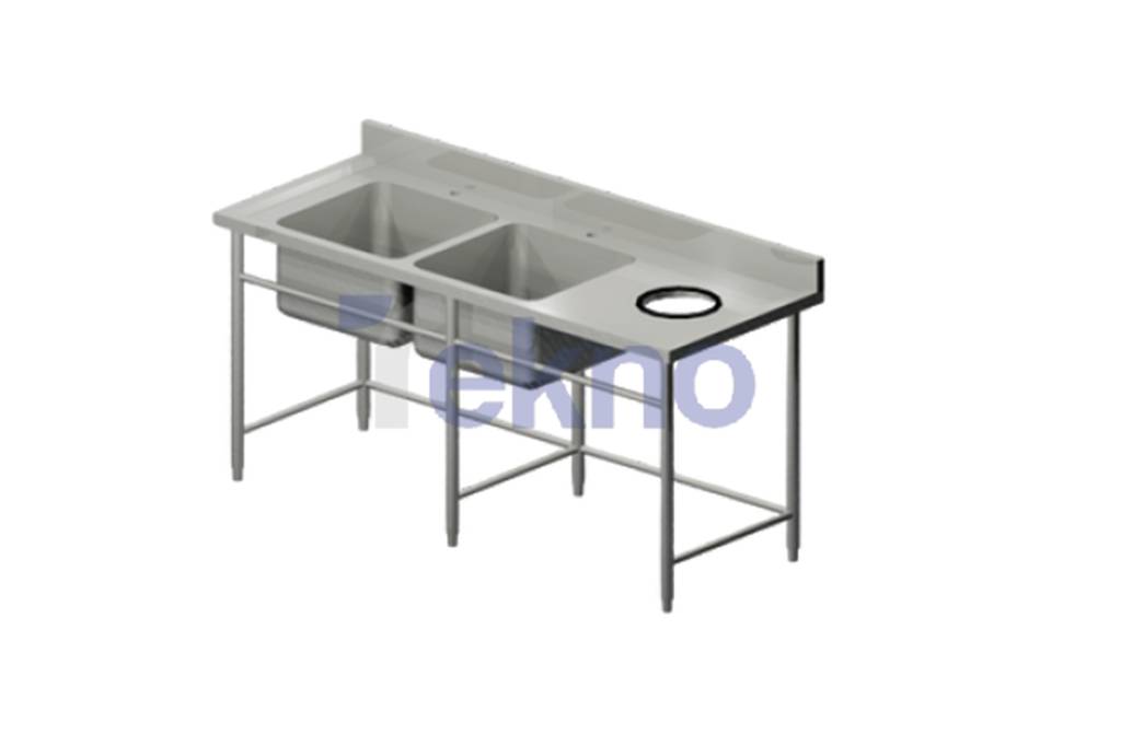 Unit sink ganda ini dirancang dengan dua fungsi, yaitu mencuci pada sisi kiri dan pembuangan sisa kotoran melalui scrab hole pada sisi kanan. Splashback membantu menjaga area tetap kering dan higienis selama digunakan. Dengan ukuran 1800x750x850/950mm, sangat ideal untuk volume kerja yang tinggi. Dapat dibuat custom agar sesuai dengan kapasitas dapur yang berbeda.